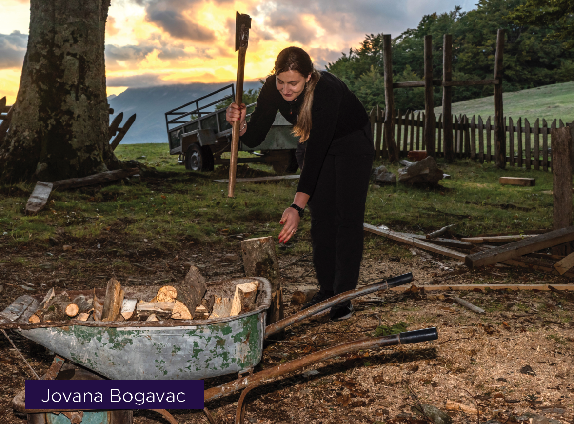 Nevjerovatne su čvrstina i upornost kojima Jovana Bogavac prkosi patrijarhalnim društvenim normama. Radi najteže fizičke poslove, tovari i cijepa drva, ali i kuvanje je njen zadatak – razvija pite, pravi sir i lisnatu pogaču kao specijalitet. Proizvodi svu hranu na gazdinstvu koju služi gostima – povrće, voće, meso, mliječne proizvode, sokove, džemove. Ovog ljeta nije imala uobičajenu majčinu pomoć, pa je morala sve sama da obavlja na katunu – od rada na njivi i pripremanja hrane, brige oko stoke, sve do prijema gostiju, spremanja koliba i odlazaka sa turistima na pješačke ture. Ustajala je u pet sati ujutru, a često je zora zaticala budnu jer tokom dana nije stigla da završi sve poslove. Gosti vole da joj pomažu – kopaju krompir, hrane krave, prasad i kokoške, gledaju kako sprema hranu u kuhinji i čude se kako ljudi ovdje glasno pričaju kao da se stalno svađaju. „Najviše uživam sa gostima u prirodi. Meni je to zanimljivo jer sa njima pričam i tako upoznajem kulturu i način života ljudi iz Njemačke, Francuske, Amerike, Italije. Sa njima uvijek nešto novo mogu da naučim“, zaključuje Jovana.